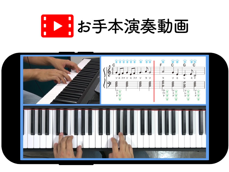 楽譜にお手本演奏動画や指番号&ドレミふりがなが付いているので、ピアノをはじめたての方でも、気軽にチャレンジできる楽譜です。