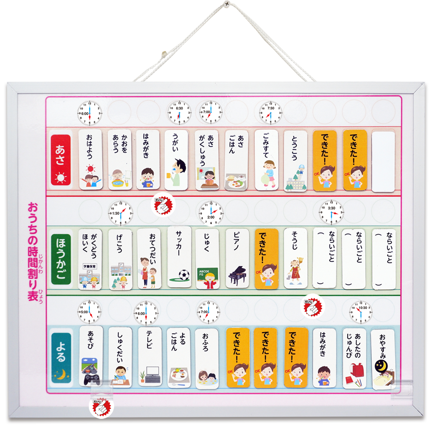 おうちの時間割りボードは、親とこどもの両方の視点から考えたこどもの「成長」と「自立」をサポートする教材です。
