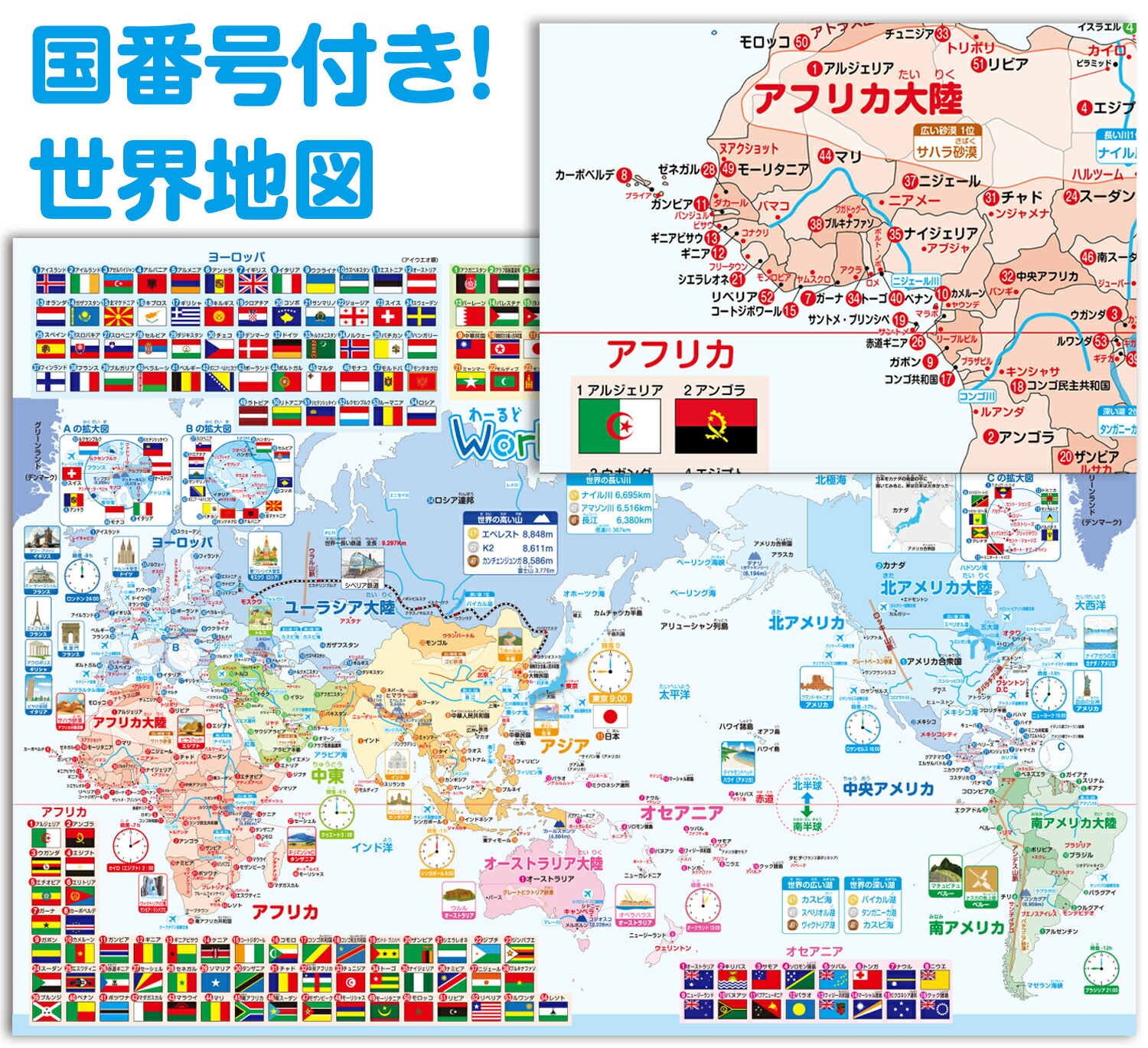 国旗に番号が割り振られているから地図から国が探しやすい世界地図ポスターです。