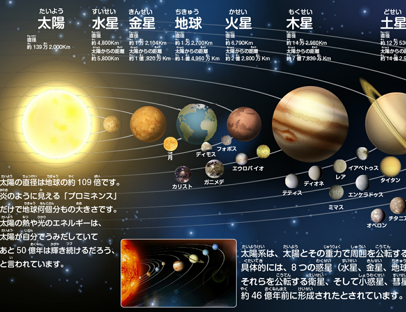 小学3年生で習う太陽系8つの惑星の順番と、惑星の周りを回っている天然の天体である衛星を覚えることができます。