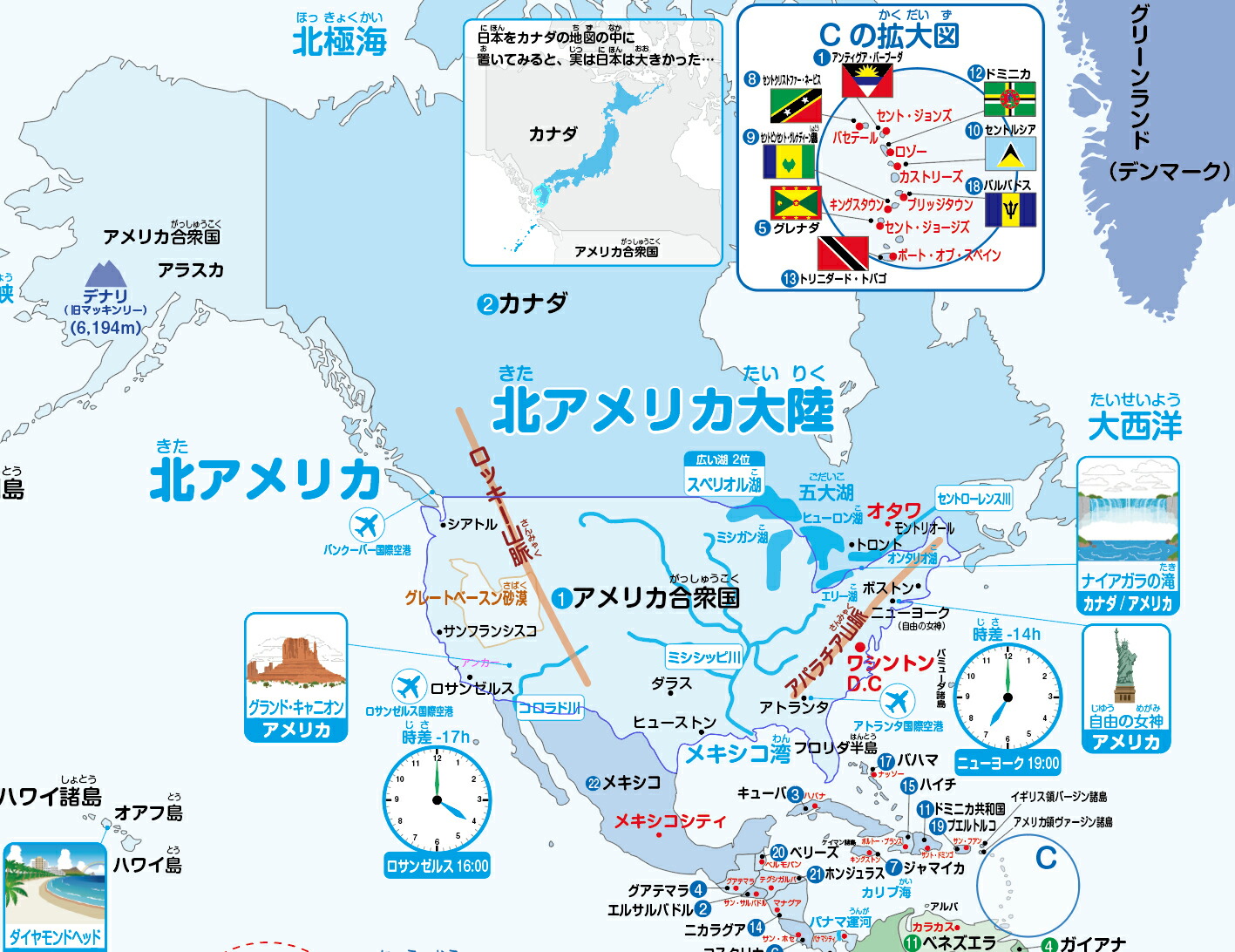 国名や首都はもちろん時差や空港、観光地、山脈、砂漠、海、川、湖など情報が満載で楽しい!