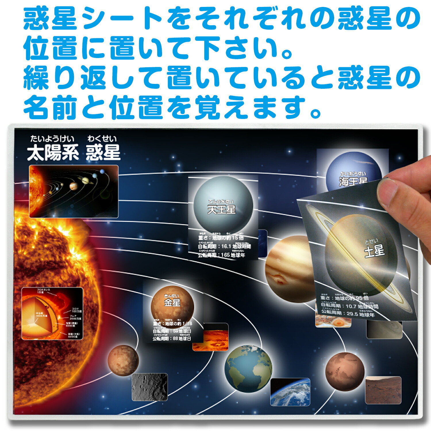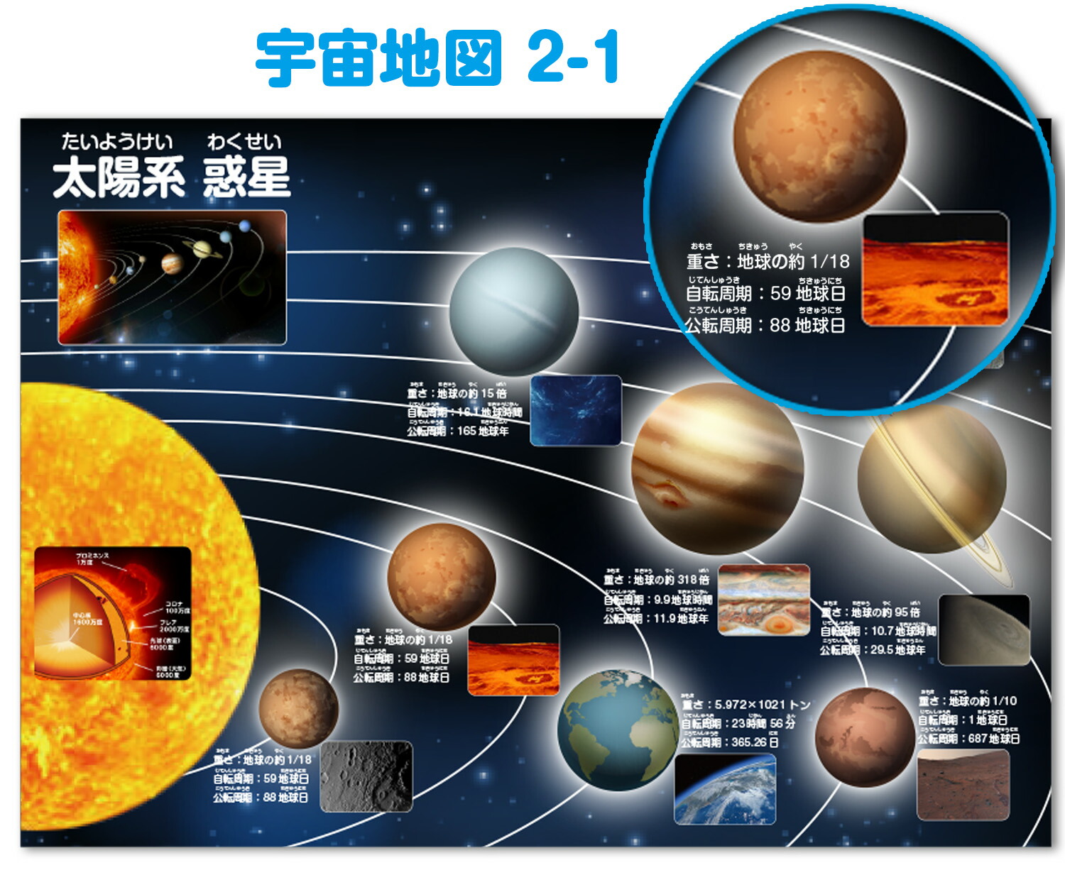 小学3年生で習う太陽系8つの惑星の順番と、惑星の周りを回っている天然の天体である衛星を覚えることができます。