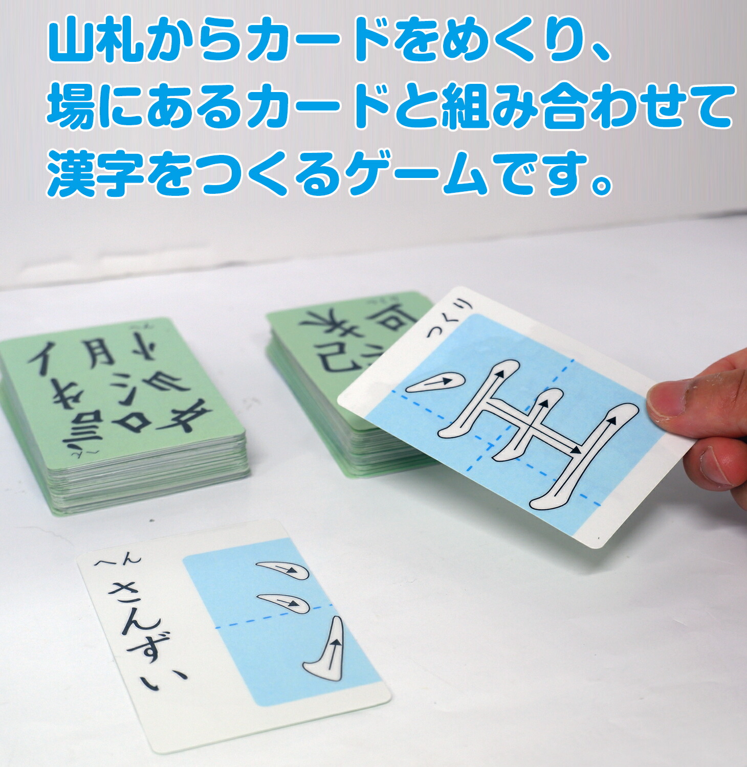 山札からカードを1枚めくり、場にあるカードと組み合わせて漢字を完成させるゲームです。