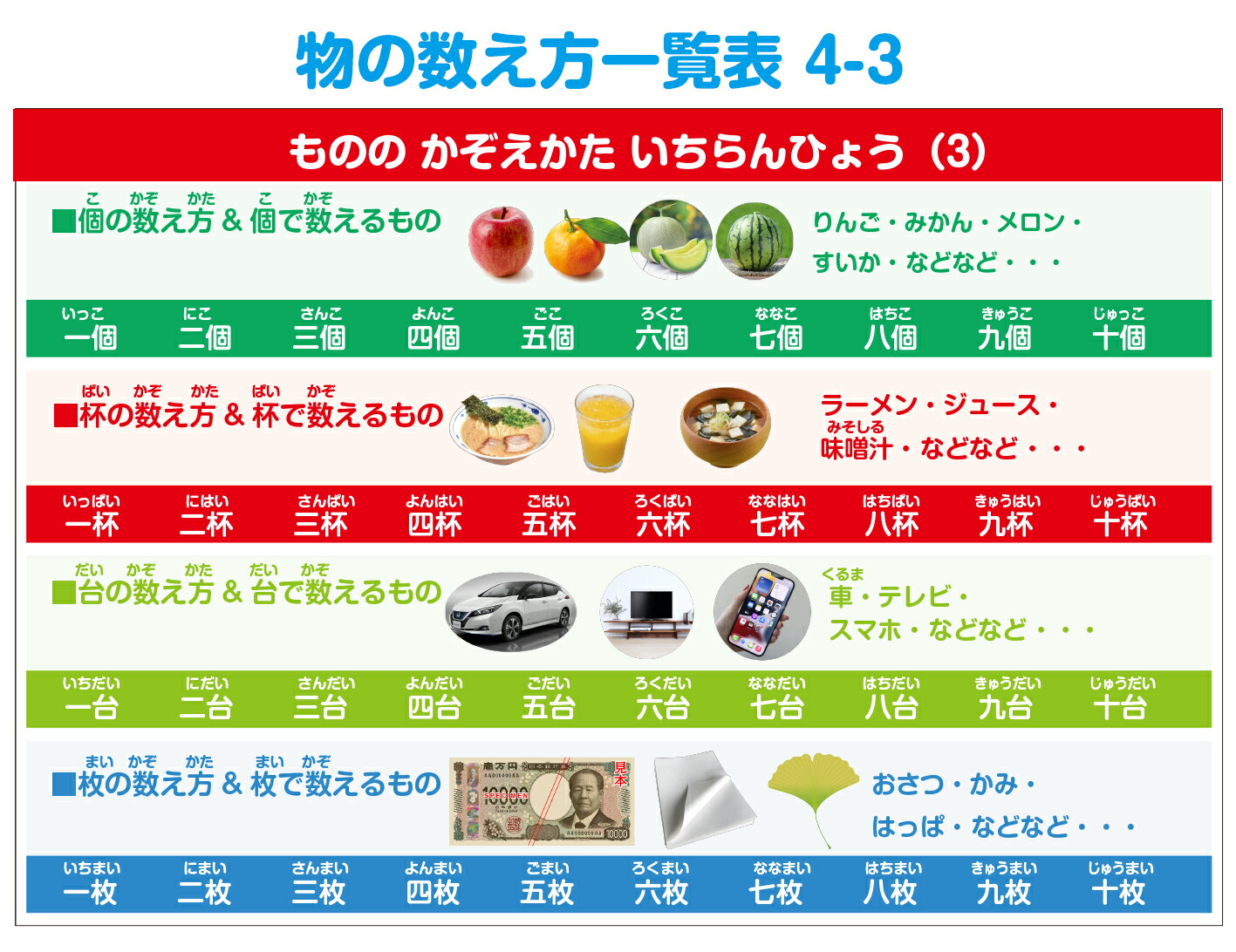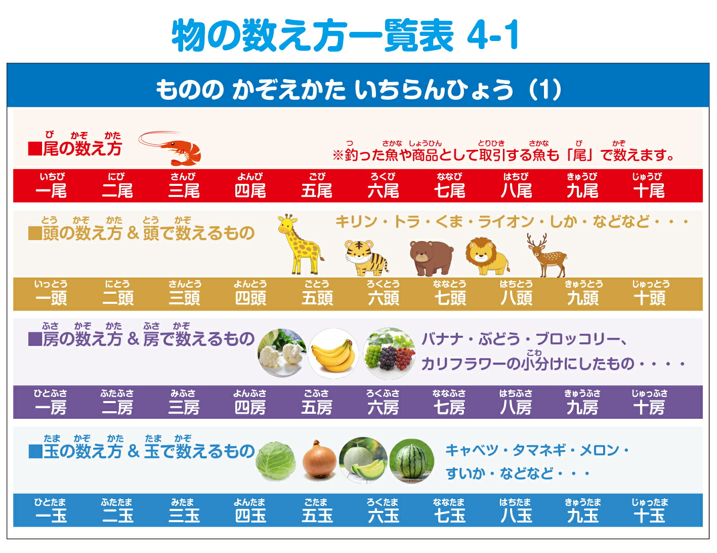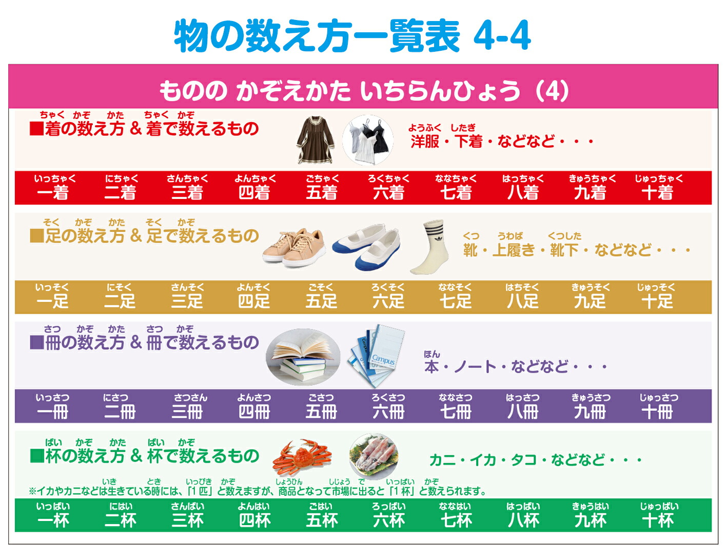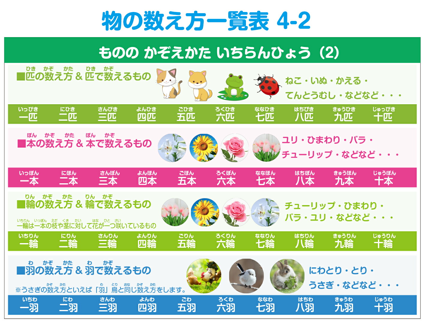 ●物の数え方一覧表×4枚(横297mm × 縦210mm)