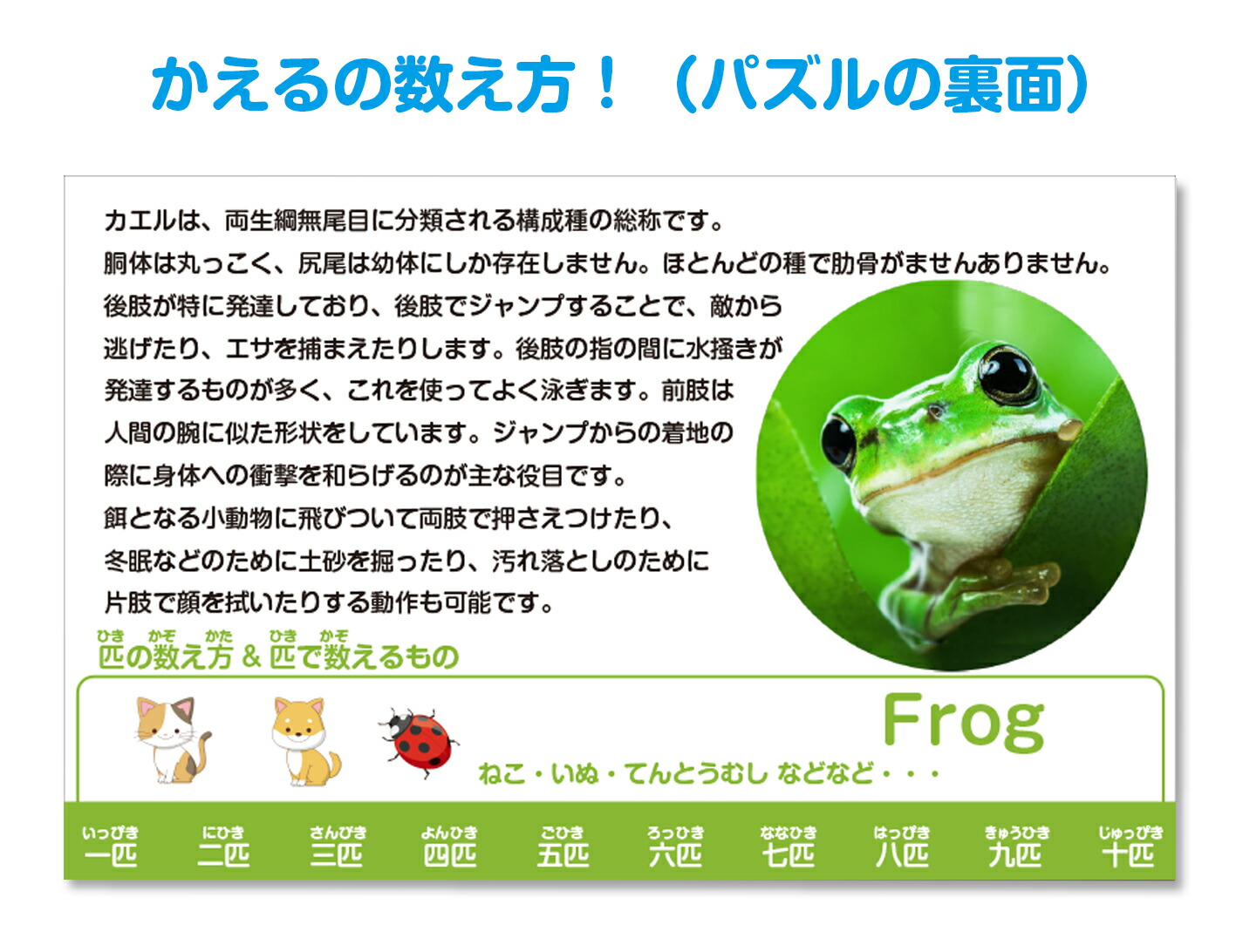 - かえる絵合わせボード:横300mm × 縦200mm × 厚み10mm / 物の数え方一覧表:横297mm × 縦210mm