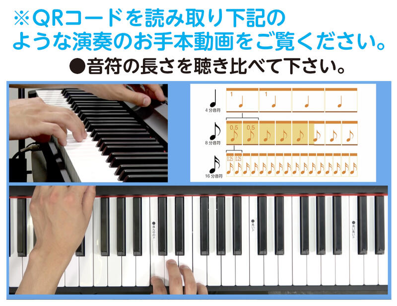 ボードの右上のQRコードから動画読み込んで音符の長さを聴き比べて下さい。