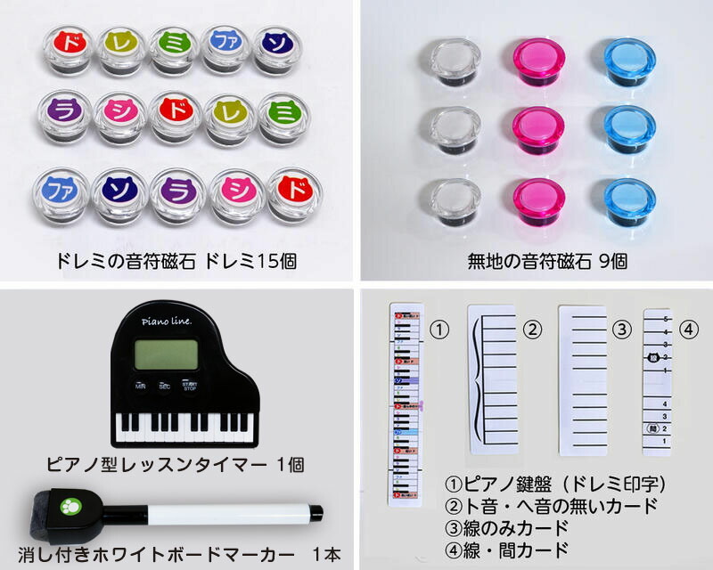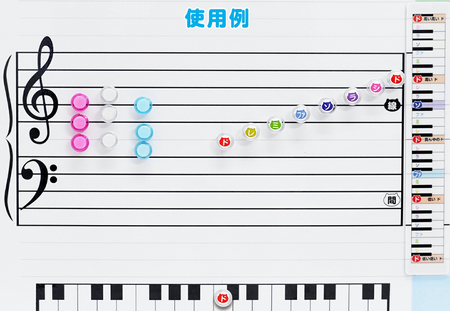 ピアノの鍵盤と大譜表は印刷されています。 音符磁石は五線譜の上に並べて使います。