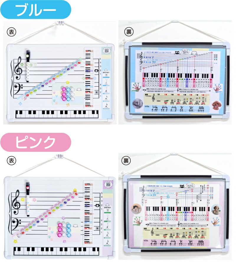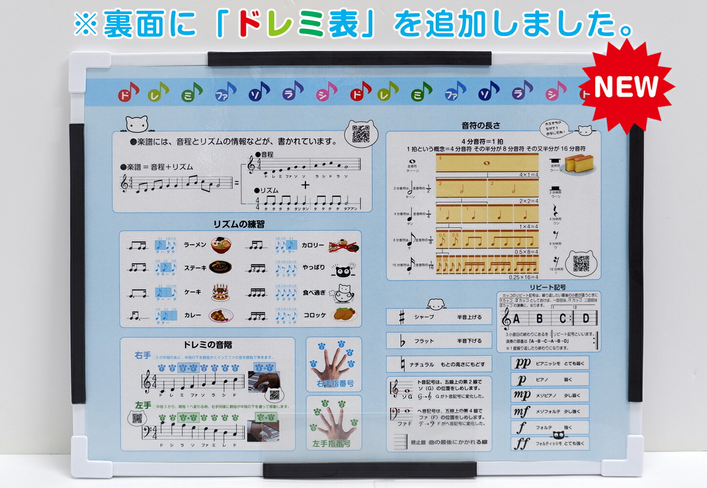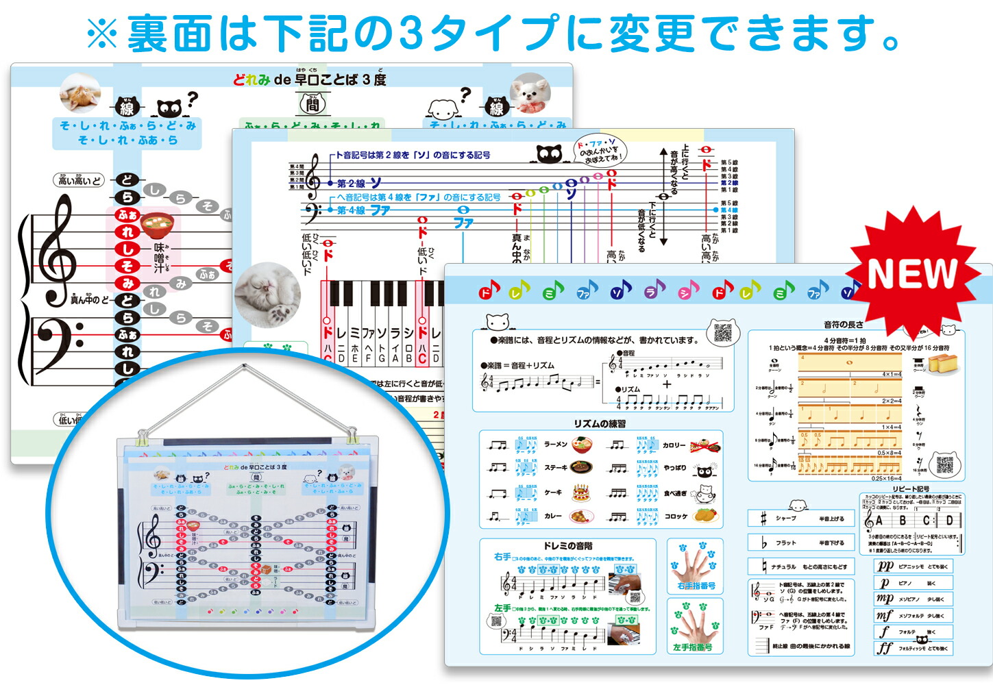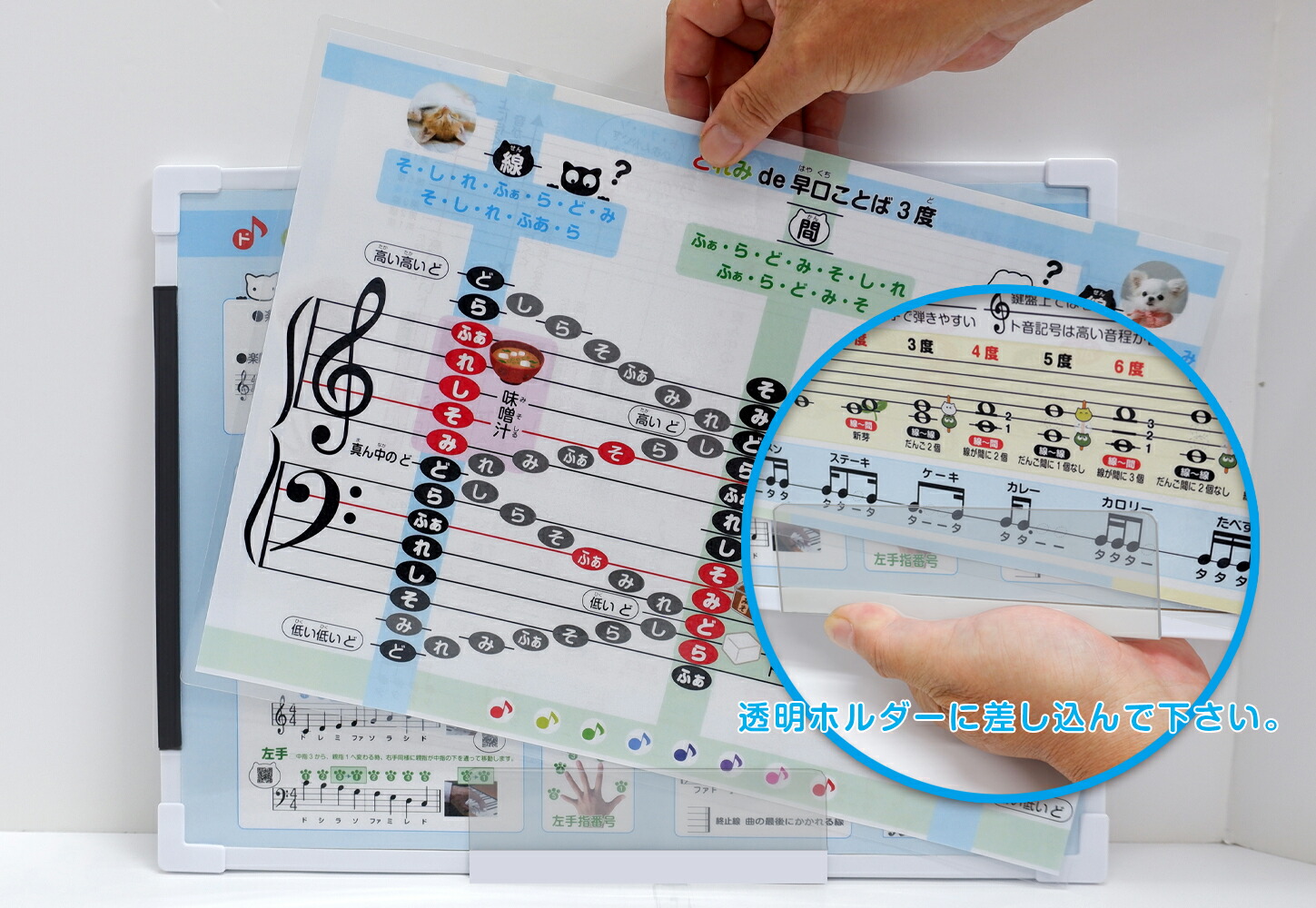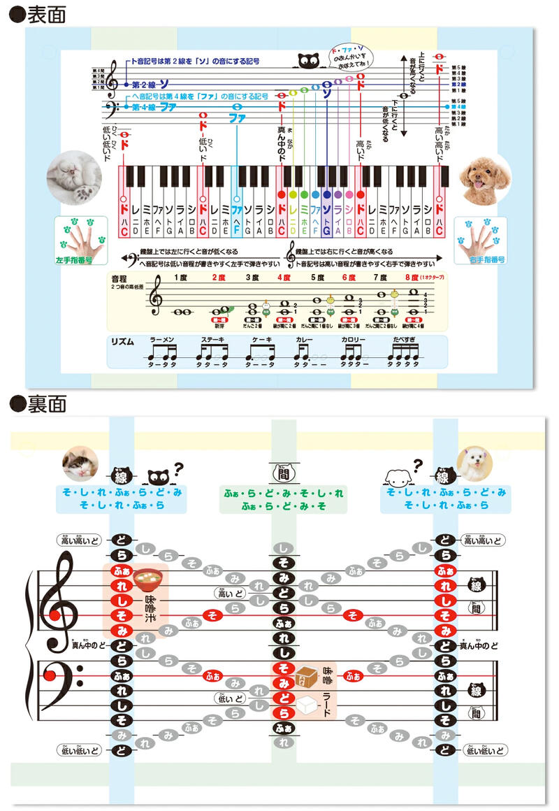 ボード裏面の台紙には、大譜表・音程・よく使うリズム ・音符の早見表が印刷されています。