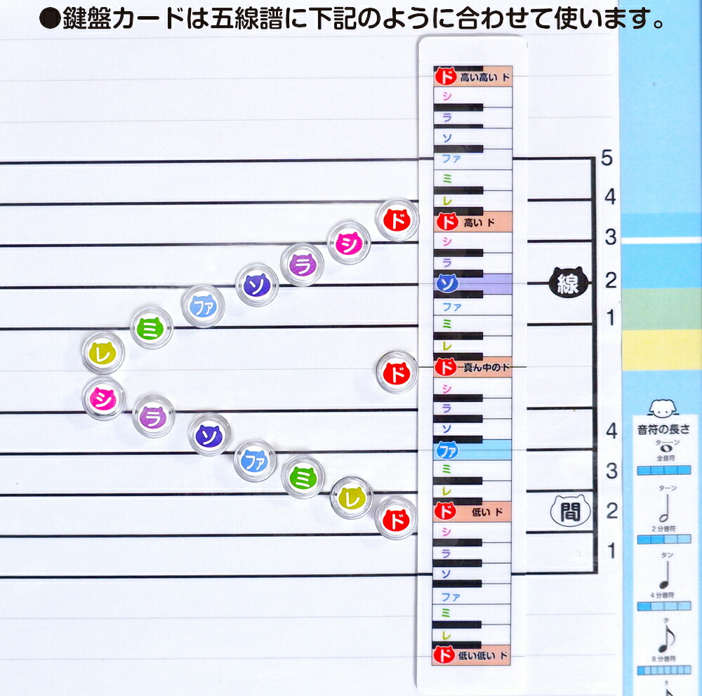 「ドレミ鍵盤カード」は五線譜に合わせてセットしたら鍵盤の位置と五線譜の音符の位置がリンクできるのでそれぞれの音符の位置と鍵盤の位置が分かりやすくなります。