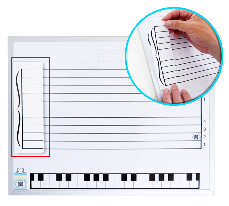 五線譜ホワイトボードの裏面には、マグネットがついていますので、黒板や壁に貼り付けることができます。生徒に教える時に便利ですね! ヒモもついていますので、壁などに掛けることもできます。