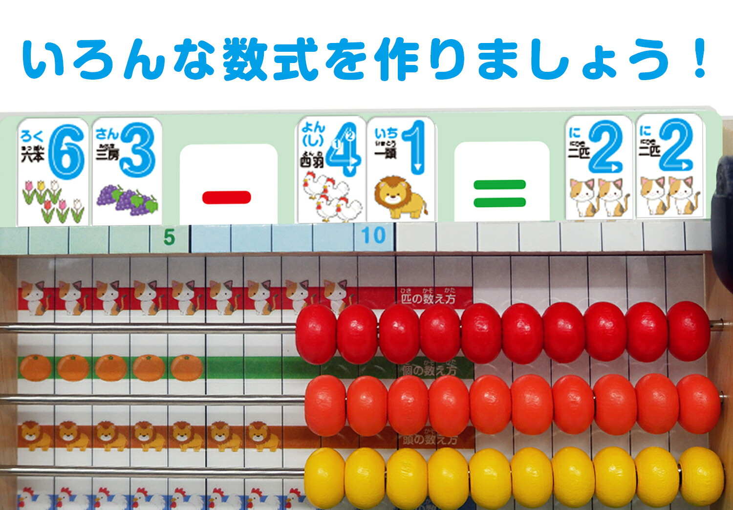 玉を動かしていくことで、数の数え方や、たし算やひき算などの計算を【目で見て】【手で数える】から視覚的に分かりやすく繰り返し遊んでいるうちに数字に強くなる知育玩具です。